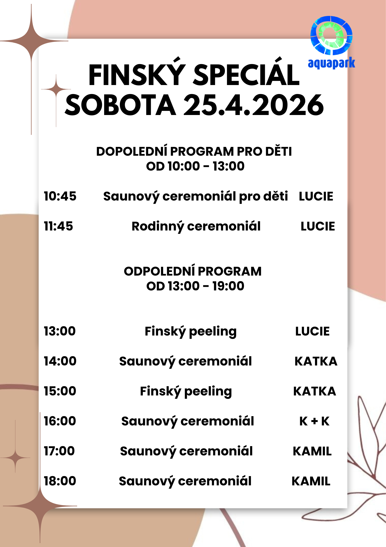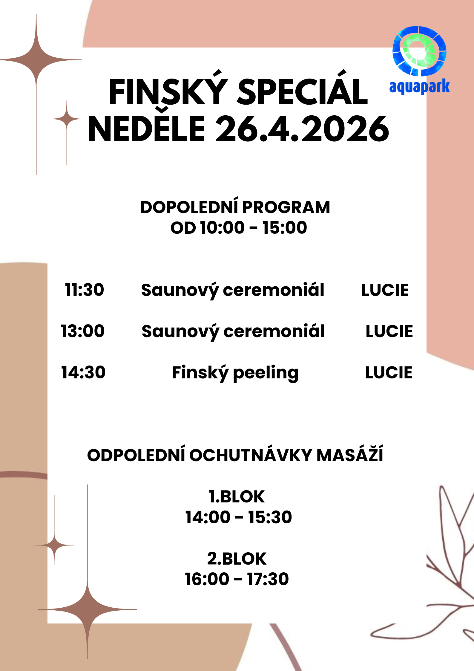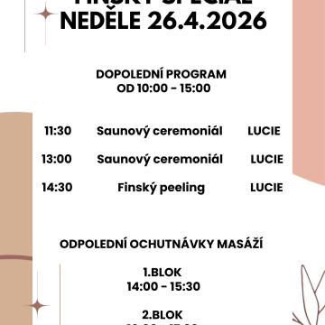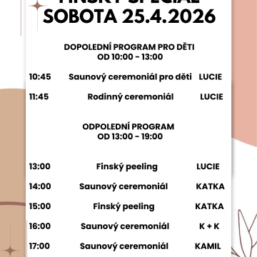 Zažijte víkend inspirovaný pravou finskou saunovou kulturou. Těšit se můžete na sanování pro dospělé a mimořádně i pro děti, speciální masáže, tematické saunové ceremoniály a peelingové procedury.