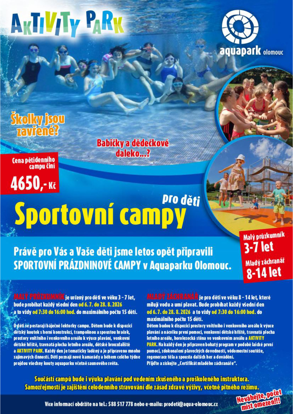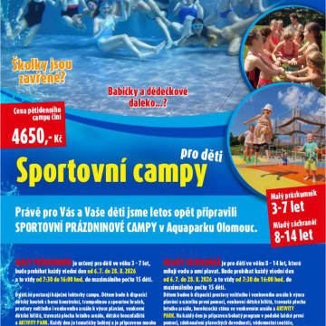Přemýšlíte už nad tím, kde Vaše děti budou trávit část letních prázdnin? V naší nabídce máme znovu oblíbené týdenní Sportovní prázdninové campy pro děti, rozdělené do dvou věkových kategorií. Rezervace budou možné od pondělí 2.3.2026 na tel. č. +420 588 517 778 (Po - Čt v čase mezi 10.00-18.00 hod.)