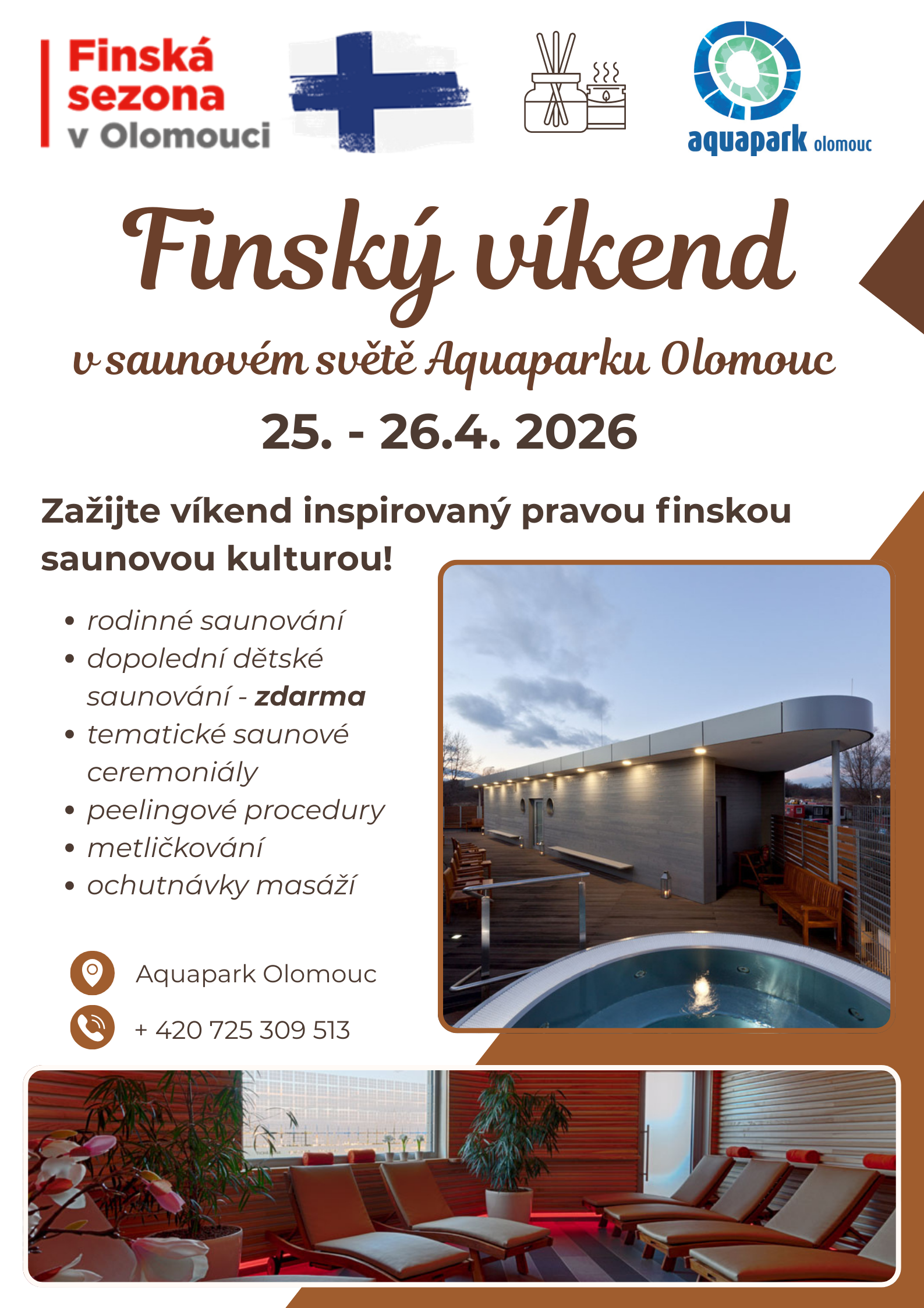 Zažijte víkend inspirovaný pravou finskou saunovou kulturou. Těšit se můžete na sanování pro dospělé a mimořádně i pro děti, speciální masáže, tematické saunové ceremoniály a peelingové procedury.